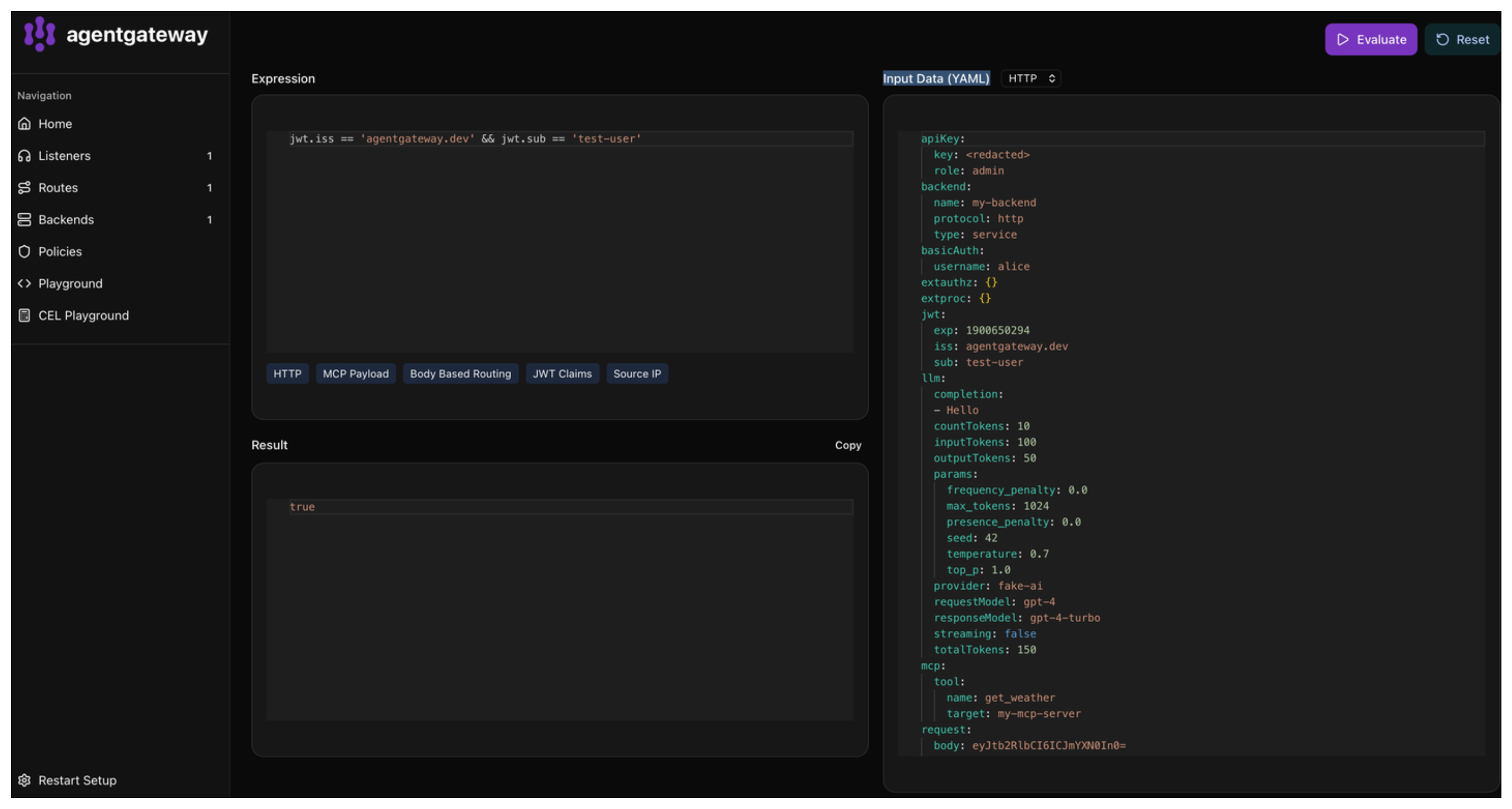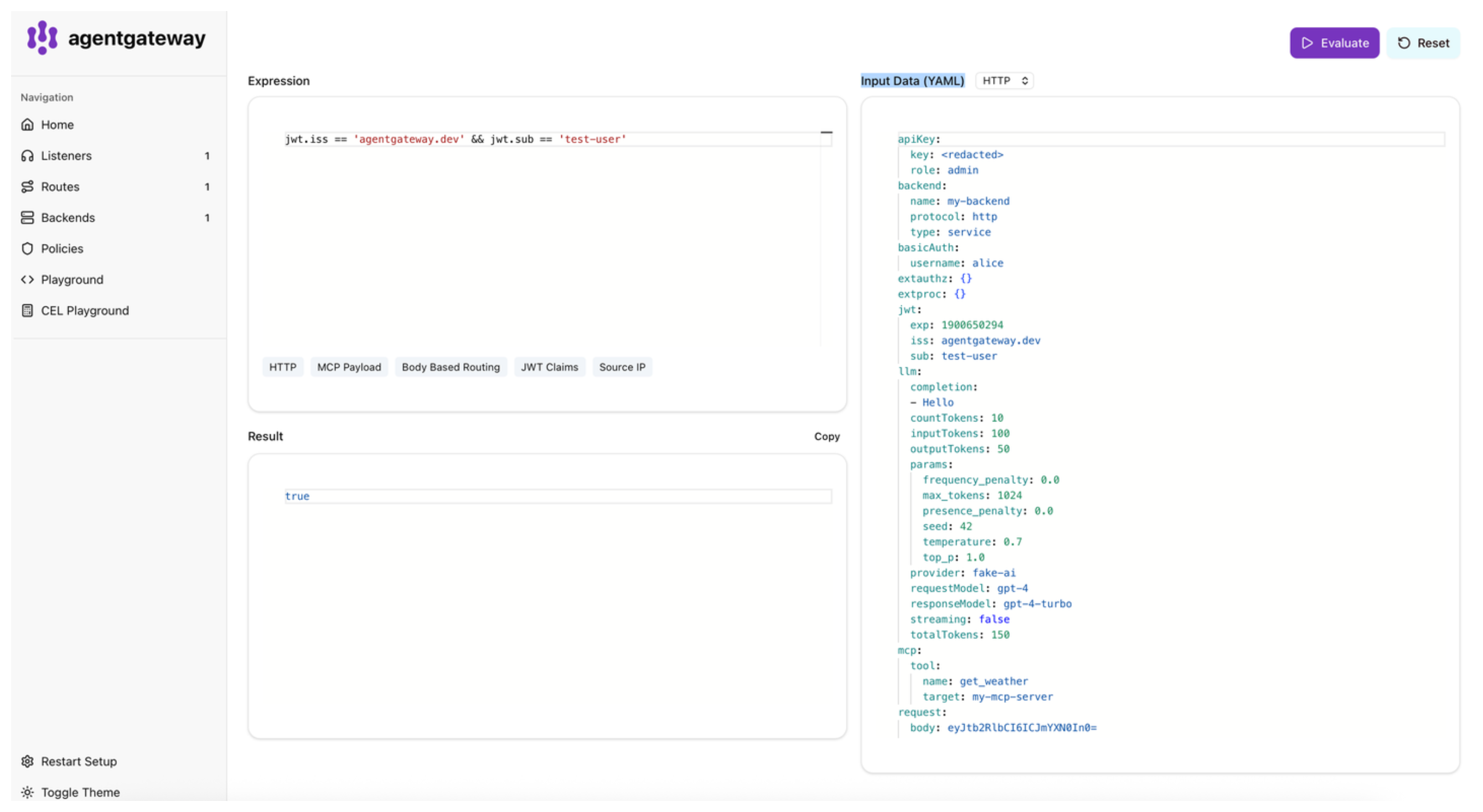 You can try out CEL expressions directly in the built-in CEL playground in the agentgateway admin UI. The playground uses agentgateway’s actual CEL runtime, so custom functions and variables specific to agentgateway are available for testing.